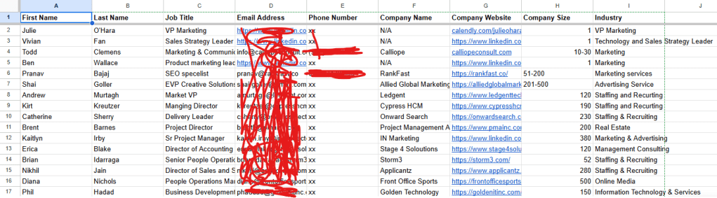A Sales Funnel is a spreadsheet of potential buyers that you wish to contact with your product. A sales should include things such as a name, company, line of business, and contact information. Above I have included my practice sales funnel for the program Slack.